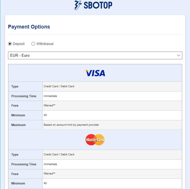 Deposits and withdrawals can be made into the SBOTOP website via a whole host of channels. All you have to do is pick a suitable currency option and then proceed to use any of any of the available methods.